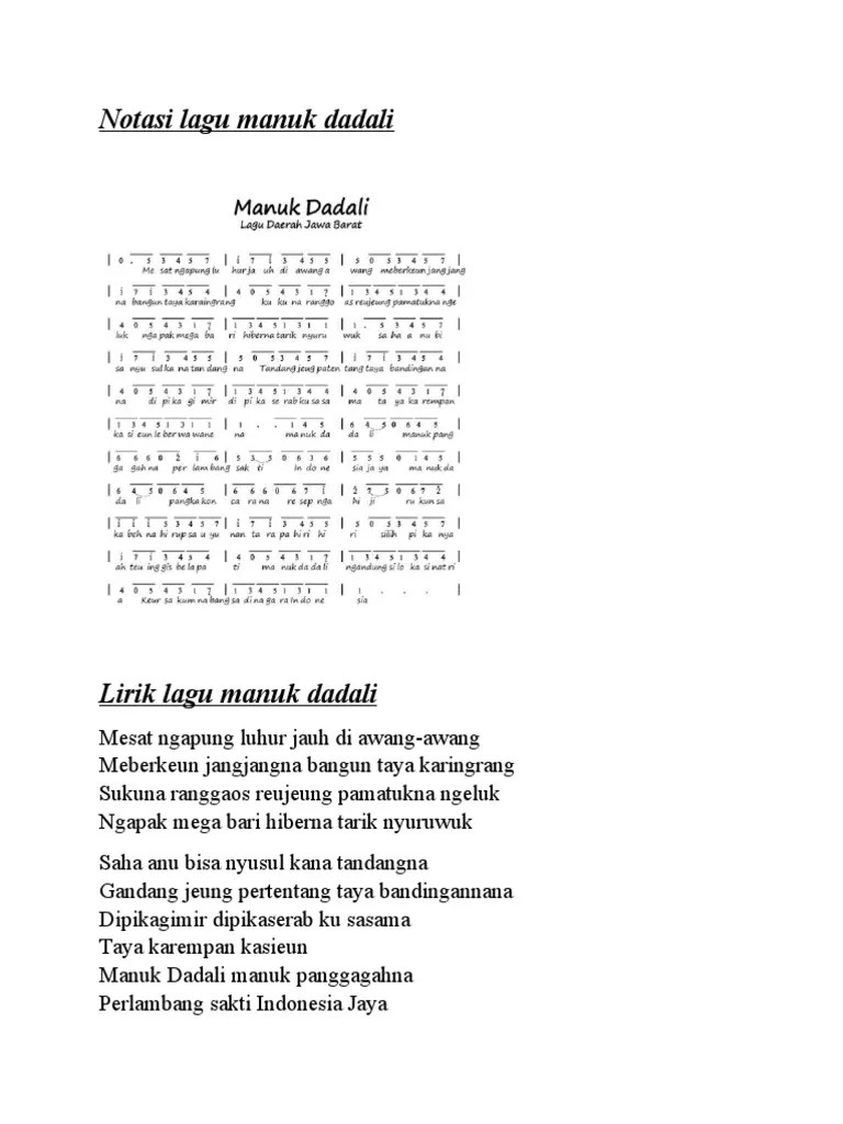 Berikut not angka pianika lagu daerah manuk dadali lengkap dengan liriknya. Not balok, not angka, juga lirik chord my heart will go on. Bagi kalian yang sedang belajar menyanyikan lagu manuk dadali kami juga melengkapinya dengan not angka dan not balok serta chord gitar yang dapat kalian . Not angka manuk dadali dari daerah jawa barat.tutorial notasi angka lagu daerah / tradisional / nusantara indonesia dilengkapi dengan not . Not angka pianika lagu daerah manuk dadali:. Level 3not balok lagu tradisional manuk dadali. Lagu nusantara daerah jawa barat / sunda.tutorial piano level 3 dilengkapi dengan notasi . Contoh karya cipta seni musik dan tari. Lagu my heart will go on , dalam tiga penulisan, notasi balok, notasi angka juga beserta lirik . Manuk dadali adalah salah satu lagu dengan lirik berbahasa sunda dari provinsi jawa barat yang dalam bahasa indonesia yaitu burung garuda. Not angka lagu manuk dadali dan not balok lagu manuk dadali disertai chord / akor dan audio untuk mendengar melodi lagunya. Lirik manuk dadali dan terjemahan bhs. Ada arti lirik buat "manuk dadali" ngak.???